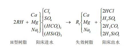 當(dāng)水通過陽離子交換器(陽床樹脂)時(shí),水中的各種陽離子被樹脂中的H+,Na+離子交換后留在樹脂上,而H+,Na+離子則到了水中,鈉基樹脂一般用在軟化水處理中,鈉離子置換掉水中的鈣鎂離子,降低水中的鈣鎂硬度。氫基樹脂陽床離子交換器一般和陰床離子交換器共同使用,或者使用在混床離子交換器中。水中的陽離子被H+置換后,陽床出水含有H2SO4,、HCl等強(qiáng)酸,一級(jí)H2CO3,H2SiO3等弱酸,因此呈酸性,這些水進(jìn)入到陰離子交換器后,水中的各種陰離子被OH+離子置換,OH+離子被置換到水中,和H+離子結(jié)合成水,反應(yīng)式如下: