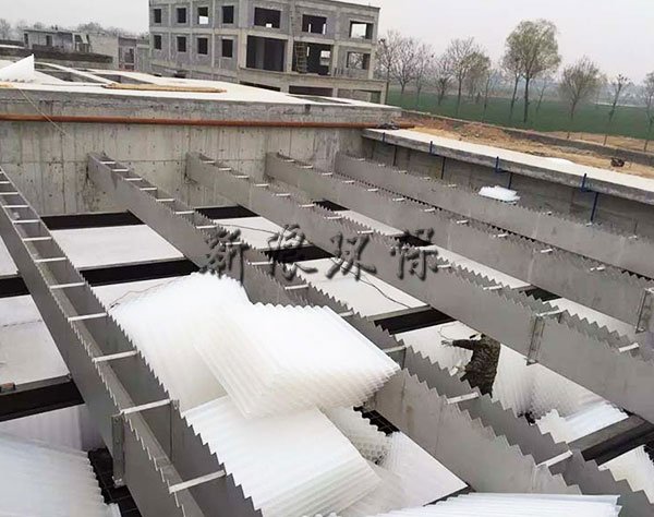 三角堰集水槽:兩側(cè)采用三角堰集水,三角堰板與槽體側(cè)板通過螺栓拼裝而成(也可為一體式),連接孔為條形孔具有可調(diào)性,堰板角度為90度,堰齒大小有50×100、80×160、100×200三種規(guī)格,板厚為3~5mm。